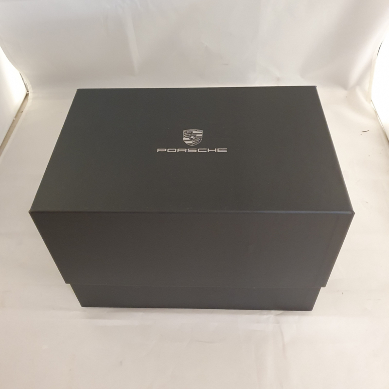 Eloxierte Aluminium-Basis mit einem gelaserten Porsche-Wappen.
