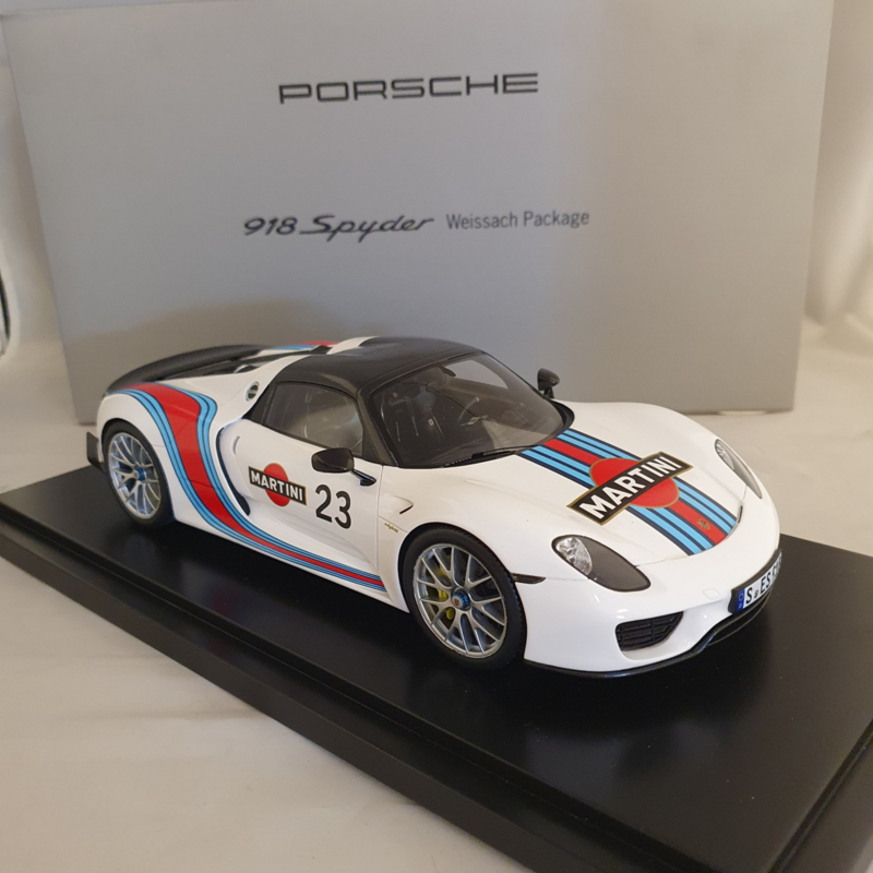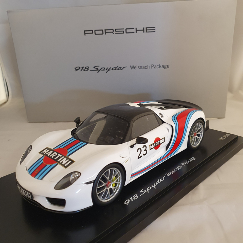 Porsche-Modell des Porsche 918 Spyder #23 mit Weissach-Paket im Maßstab 1:18. Dieses detailliert ausgeführte Sammlerstück hat ein weißes Äußeres mit Martini Racing-Lackierung.